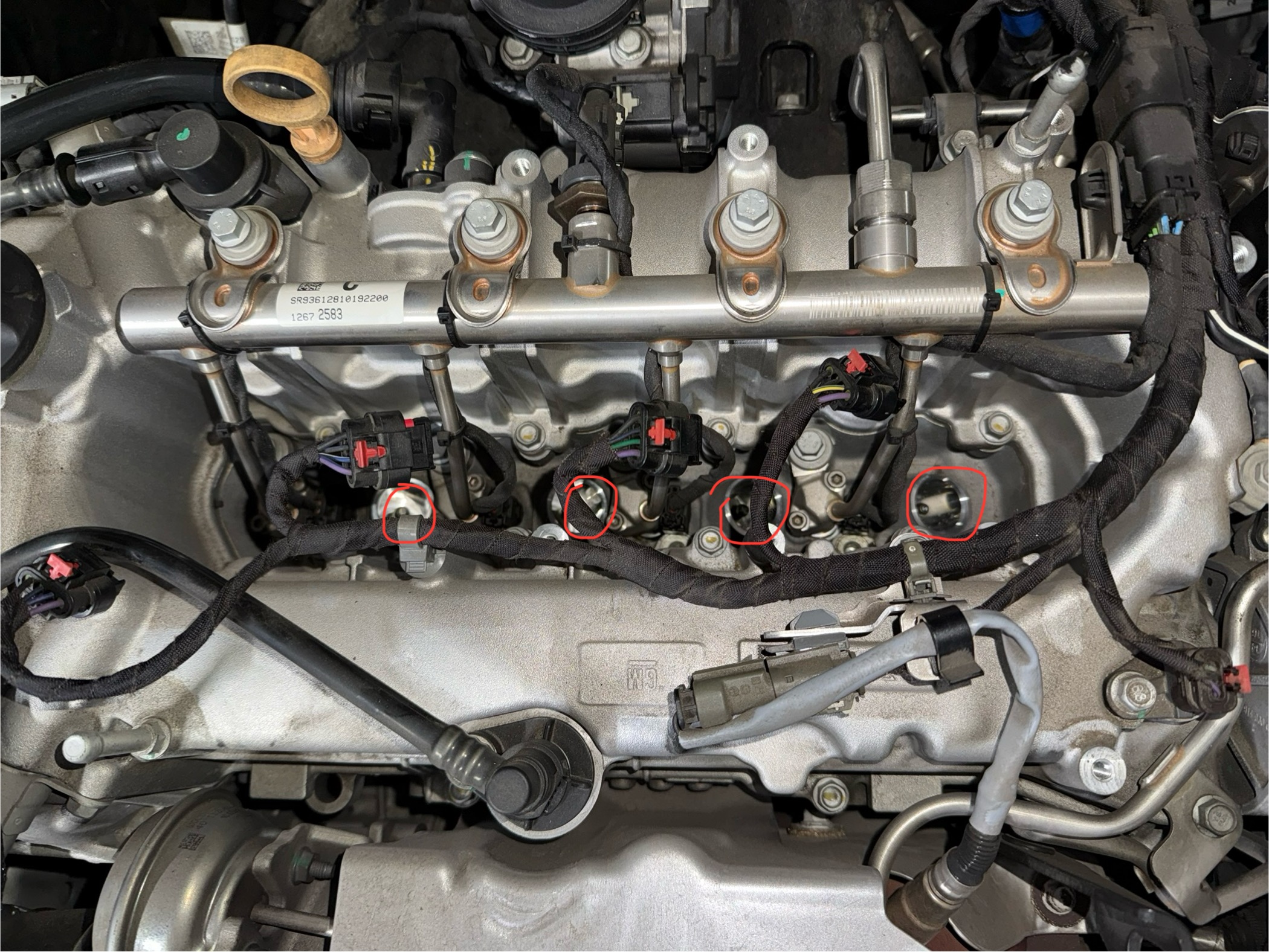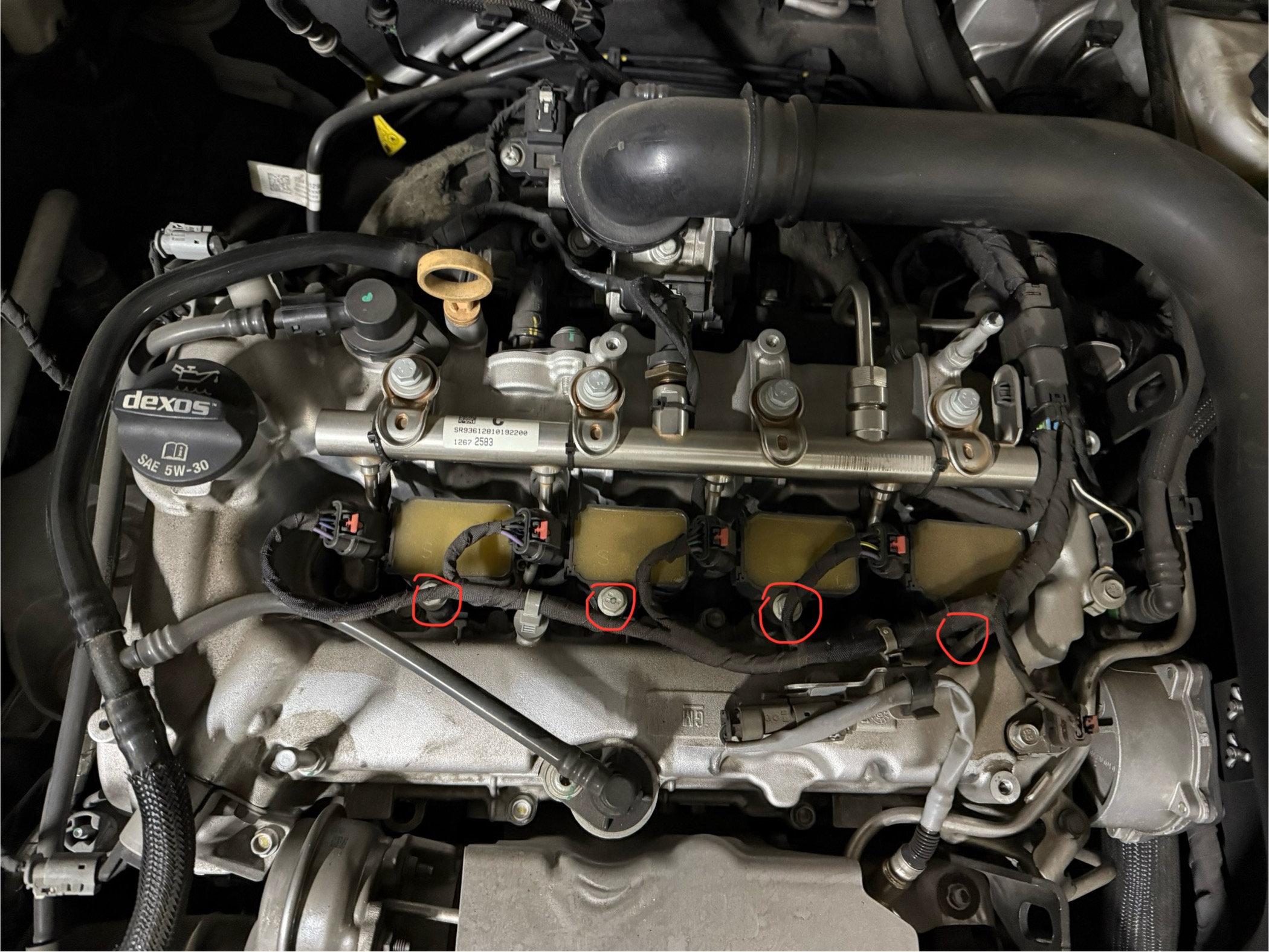 빨간 동그라미로 표시된 네 개의 구멍에 점화플러그가 보인다. 운전석 방향으로 기울어져 있다.